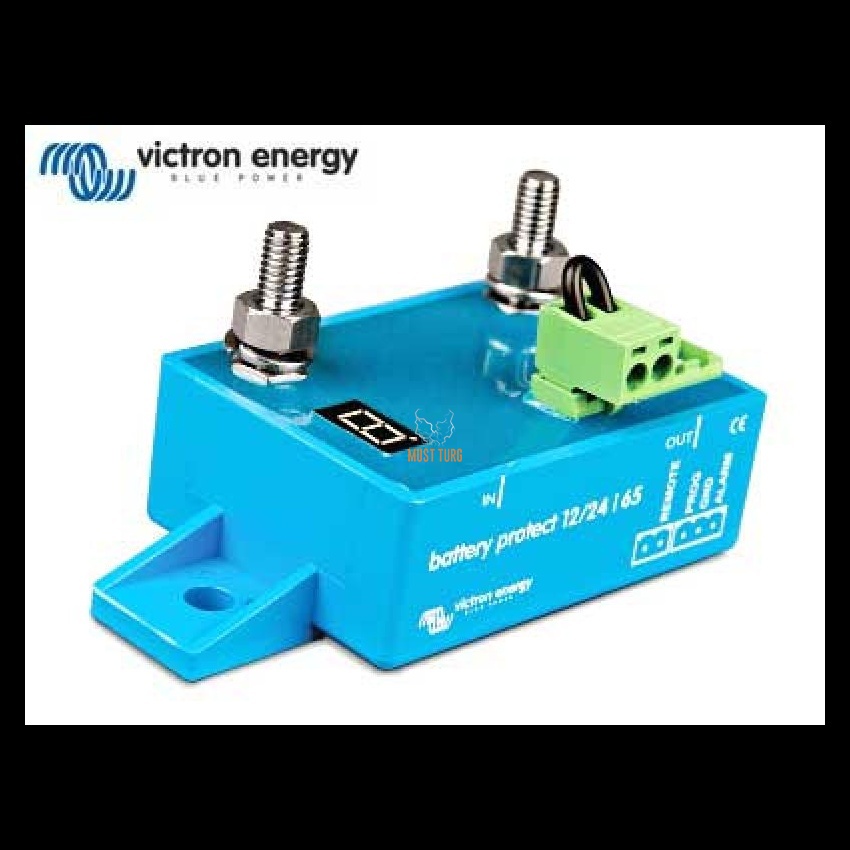 Kirjeldus: 12/24V: tuvastab automaatselt süsteemi pinge, ühendab aku ebaolulistest tarbijatest lahti enne kui see täiesti tühjaks saab (mis kahjustab aku eluiga) või enne kui akupinge langeb alla mootori käivitusvoolu.Täpne pinge, millal aku lahti või tagasi ühendatakse, on seadistatav. Valitud seadistus kuvatakse ekraanil. Eraldi seadistus Li-ion akudele: kontrollitav läbi VE.Bus BMS'i. Kasutatav ka laadimise peatajana akulaadija ja Li-ion aku vahel. Väga madal voolutarve. Ülevoolukaitse: ennetab kahjustusi tundlikele seadmetele, vool ühendatakse lahti kui DC vool ületab 32V, süttimiskindel, sädelemiskindel. Alarmsignaal: signaaliväljund aktiveeritakse kui akupinge tase on alla seadistatud tasemet üle 12 sekundi, signaal on lühisekindel, signaaliväljundit kasutatakse tüüpiliselt koos mingisuguse LED tule või releega. Kui akupinge ei taastu seadistatud tasemeni 90s jooksul pärast alarmsignaali aktiveerumist, lülitatakse tarbimine välja. Tarbimine lülitatakse tagasi sisse 30 sekundit pärast akupinge taastumist eelseadistatud tasemeni. 6-35V, max vool: 65A pidev - 250A hetkeline @30s, voolutarbimine 1.5mA (on) - 0.6mA (off), alarmsignaali väljundi viide 12s, max tarbimine alarmsignaali väljundil: 50mAm, vaikimisi seadistused: lahtiühendus 10.5/21V - ühendus 12/24V, töötemperatuur (max võimsus) -40°C ... +40°C (60% nominaalvõimsusest: +50°C), IP67 (elektroonika) - IP00 (ühendused), M6 ühendused, 0.2kg