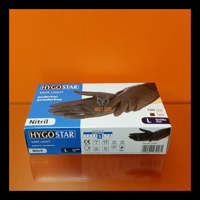 Õhemad puudrita nitriilkindad, tekstuursed sõrmeotsad, pikkus 24cm, õli- ja rasvakindlad, AQL1,5, ASTM D6978-05, CAT3, EN374-2, EN374 AKL, EN420, EN455 1-4, CE0321