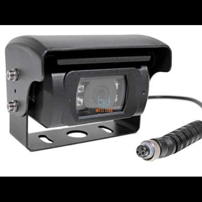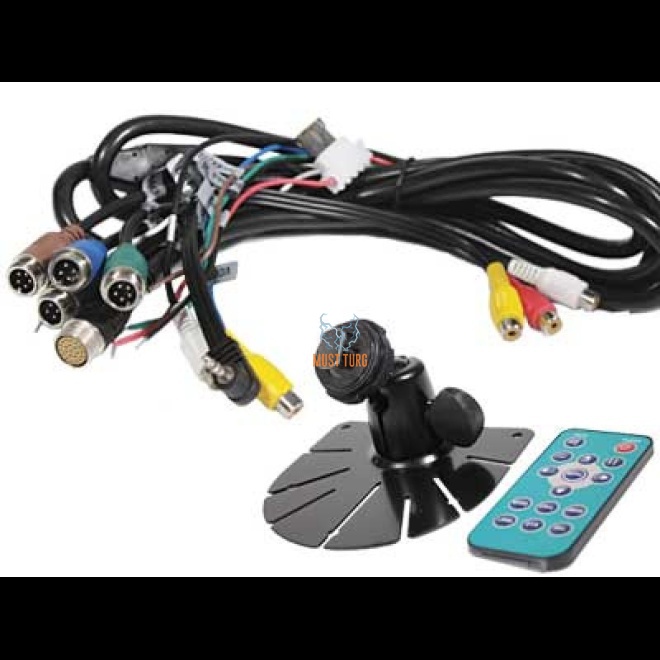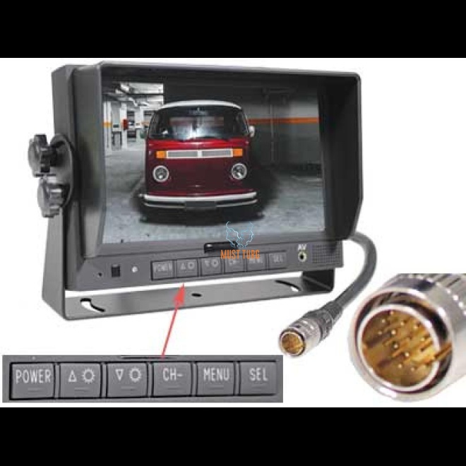 Kirjeldus: 7" ekraan, 2 katiku- ja IR-LEDidega kaamerat, 5-pin, kaamerakaablid müügil eraldi. Kaamerad (2tk) 12V, katiku ja soojendusega, 180°, 4 IR-LEDi, 5-pin kaablid müügil eraldi. EKRAAN: 7" TFT-DVD, 1 pilt, 2400x480px, 500:1, 400cd/m², 16:9. Võimalik ühendada 4 kaamerat ja DVD, 2 erinevat hoidikut, pult, ühenduskaablid