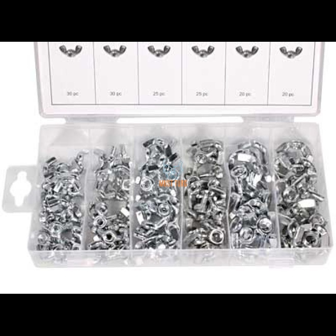 Kirjeldus: Wing nuts 150pcs, M-sizing, size (pcs): M5x24 (30), M5x32 (30), M6x20 (25), M6x28 (25), M8x18 (20), M8x24 (20)
