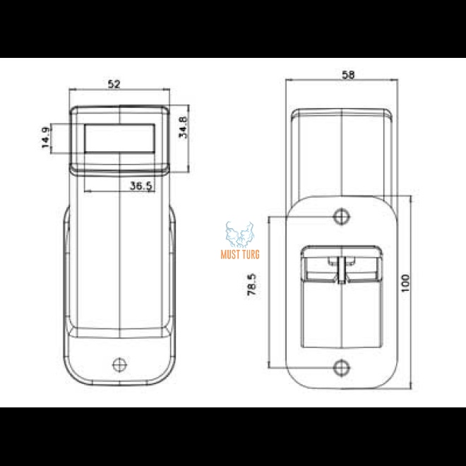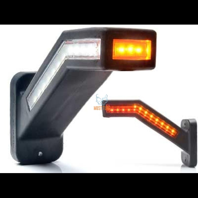Kirjeldus: vasak, tuled: valge (ees) - kollane (küljel) - punane (taga), dünaamiline suunatuli, pidurituli, kummivars, sõidukitele: M2, M3, N2, N3, O2, O3, 04; jalg: 100x58mm, kinnitus: 2 kruvi, kruvivahe 78.5mm, 400mm juhtmed 4x0.75mm² , IP66/68, ECE, E, ECE R6, R7, R91, R10, tuled: ees 0.5W 12V - 0.9W (24V), küljel 0.3W (12V) - 0.6W (24V), taga 0.2W (12V) - 0.5W (24V), pidurituli: 0.9W (12V) - 1W (24V), dünaamiline suunatuli: 5.6W (12v) - 5W (24V)