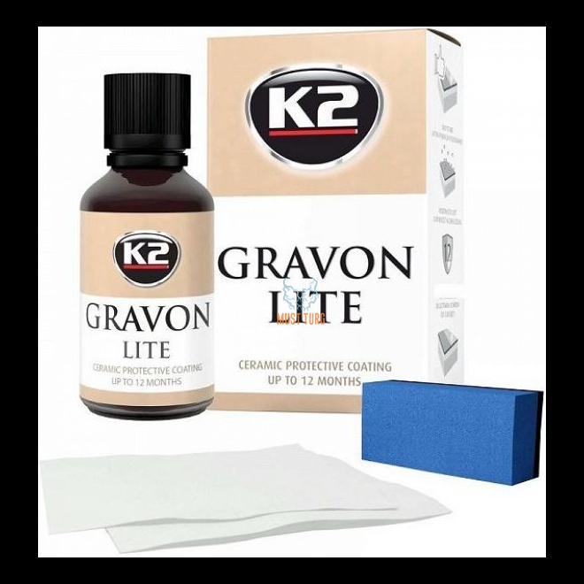 Keraamiline pinnakaitsevahend, mis kaitseb pinda kriimustuste, mustuse, UV-kiirguse ja muude väliste tegurite eest. Ühekordselt kattes annab kaitse 12 kuuks, kasutades kihtidena suureneb kaitse iga järgmise kihiga kuni 24 kuud. Keraamiline kate on suurepärane alternatiiv vahatamisele ning tänu suurepärastele mustust tõrjuvatele omadustele väheneb vajadus autot nii tihti pesta. Erinevalt vahadele ei ole keraamiline pinnakaitse maha pestav, ainus viis eemaldamiseks on masinpoleerimine. Keraamiline kate kaitseb ka graffitite eest, värv ei kleepu pinnale ja on kergesti eemaldatav. 50 ml on piisav u 3 kihi peale kandmiseks + velgede kaitseks (sõltuvalt auto suurusest). Komplekt sisaldab K2 Gravon Lite 50 ml, aplikaatorit ja 2 lappi.