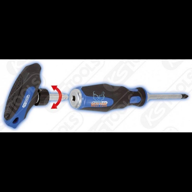 ERGOTORQUEmax läbiva löökpeaga kruvikeerajate komplekt. Peaosas 1/4" adapteriava. Pidemeosa komposiitmaterjalist. Kõigil kuvikeerajatel mutrivõtmega keeramise võimalus. Kroom vanaadiumist. Erikarastusega tipuosa. Plastkohvris.