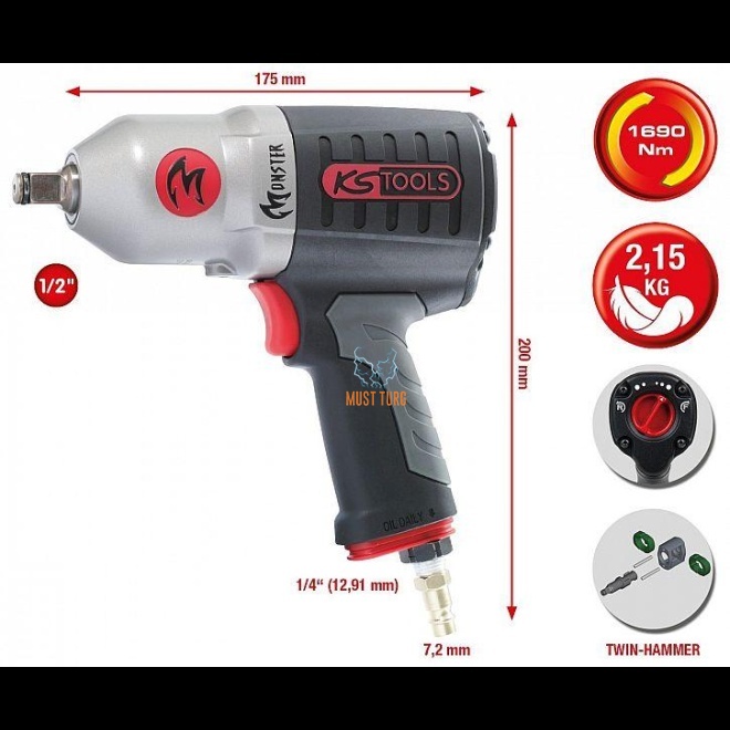 MONSTER seeria löökmutrikeeraja. Oma klassi võimsaim! Kolmeastmeline löögijõu reguleerimise võimalus korpuse tagaosas. "Twin Hammer" löökmehhanism. Libisemiskindel käepide. 1/2" keeramisadapter. Keeramismoment 510-931 Nm, max 1690 Nm (lahtikeeramisel). Pikkus 200 mm. Kaal 1,99 kg. Keskmine õhukulu 178 l/min. Vooliku min Ø 10 mm. Töörõhk max 6,3 bar. 1/4" kiirliide (kaasas).
