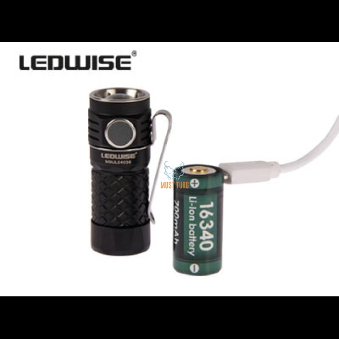 Pakendis kaasas 1x 16340 700mAh USB-taaslaetav aku. Alternatiivina sobib ka CR123A aku, kuid siis töötab tuli 50% võimsusega.