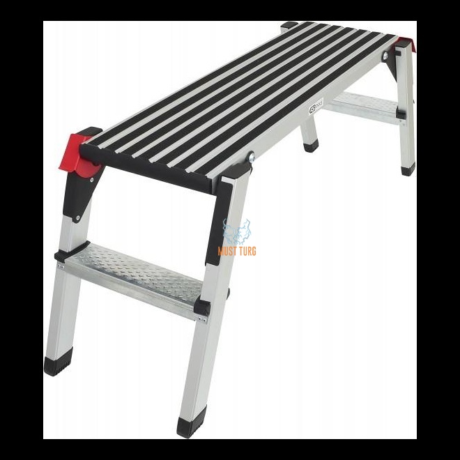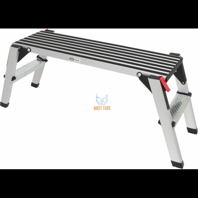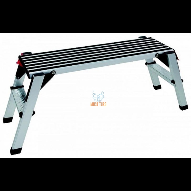 Alumiiniumist töölava. Libisemiskindel ülaosa. Mõlemal pool aste. Turvalukustitega. Kuna on kokkupandav, siis ladustatuna võtab väga vähe ruumi.