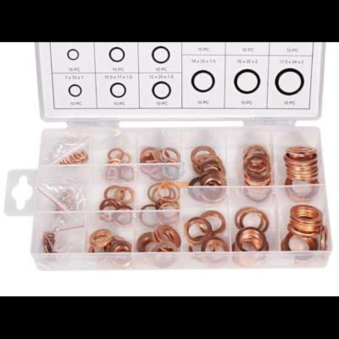 Kirjeldus: Copper washers 150pcs, 15 different sizes, sizes mm (10 pcs each): 5x10x1, 6x10x1, 7x10x1, 8x12x1, 10x16x1, 10.5x17x1.5, 11x17.5x1.5, 14x18x1, 12x20x1.5, 12.5x20x1.5, 14x20x1.5, 15x20x2, 16x22x2, 16.5x24x2, 17.5x24x2